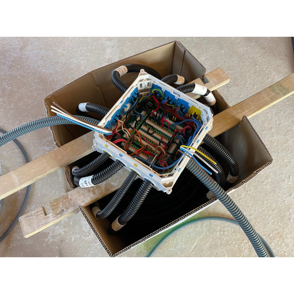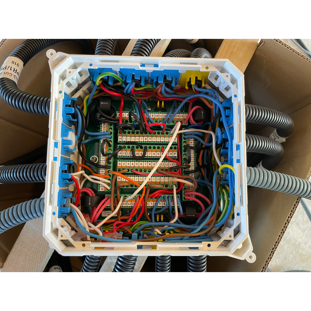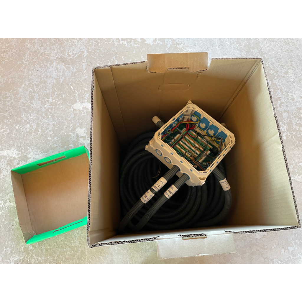 - Vous ouvrez le couvercle du haut(donc du fond) pour dérouler les gaines (alimentations en premiers, puis les autres).
